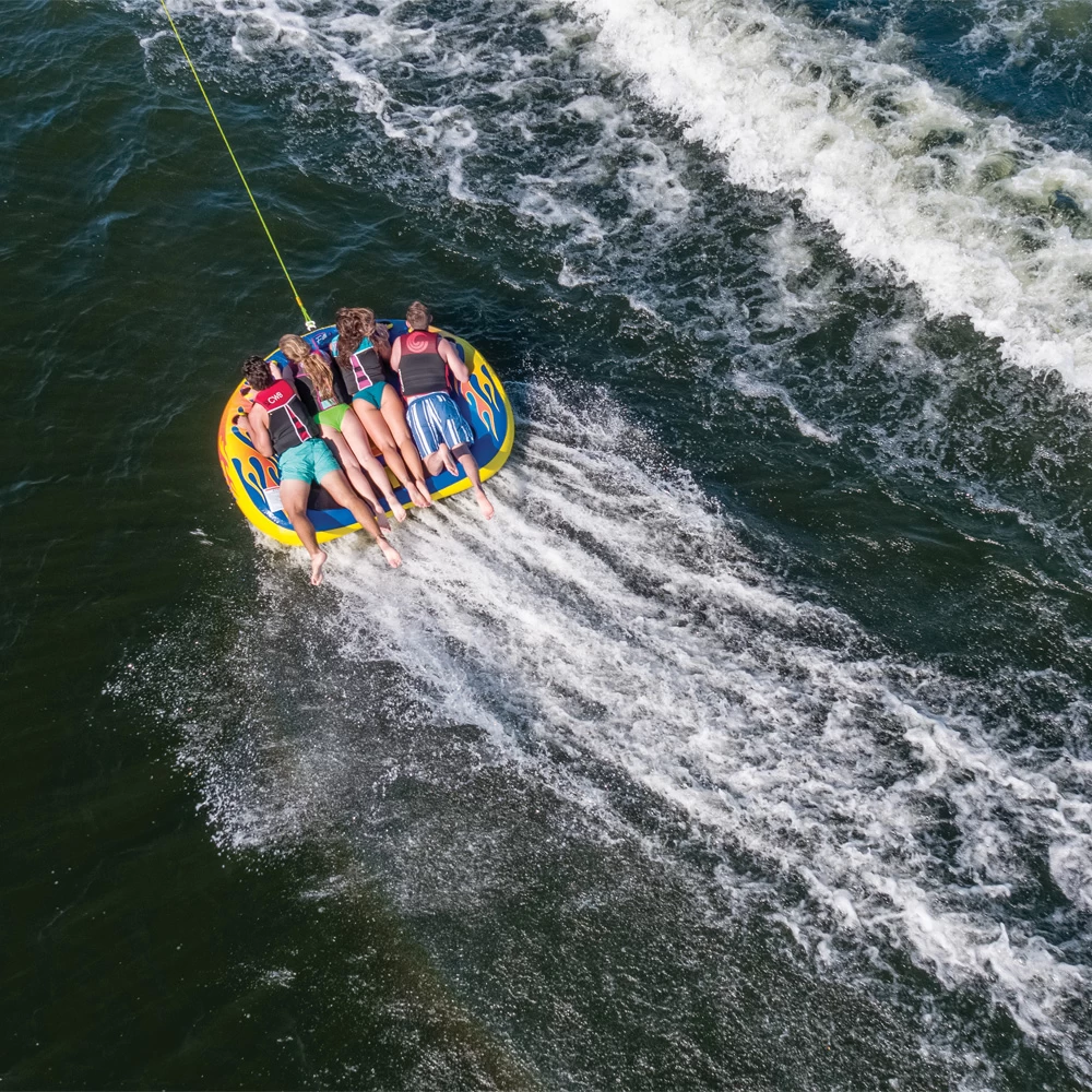 Embarquez pour une aventure avec le Connelly Convertible 4. Vous pouvez vous allonger sur ce funtube avec 4 personnes en mĂÂȘme temps. Accrochez-vous aux poignĂ©es et que l’aventure commence ! Le funtube est fabriquĂ© en nylon 420D robuste et dispose de 2 coussinets en mousse EVA souple sur le dessus pour encore plus de confort. Le funtube a une longueur et une largeur d’environ 180x205cm, il y a donc beaucoup de place pour 4 personnes.Â