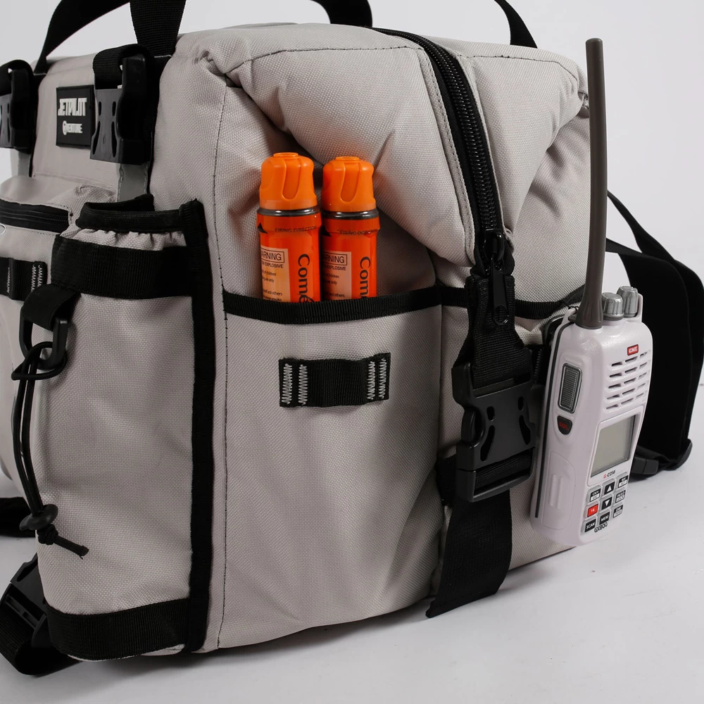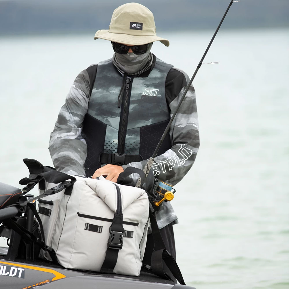 Jetpilot Venture Esky waterscooter drybag. Le sac Venture Esky vous offre un espace de rangement supplémentaire à bord de votre motomarine. Le sac a une capacité de 46 litres, est équipé d’un compartiment réfrigérant et est également étanche. Ãquipé de fermetures éclair étanches et de sangles super robustes pour la fixation.2 sangles avec crochet pour fixer votre sac à l’arriÚre de votre motomarine et 2 sangles pour fixer sur le dessus de votre selle. Peut aussi se porter en sac à dos. Le sac est équipé de compartiments spéciaux où vous pouvez attacher 2 cannes.